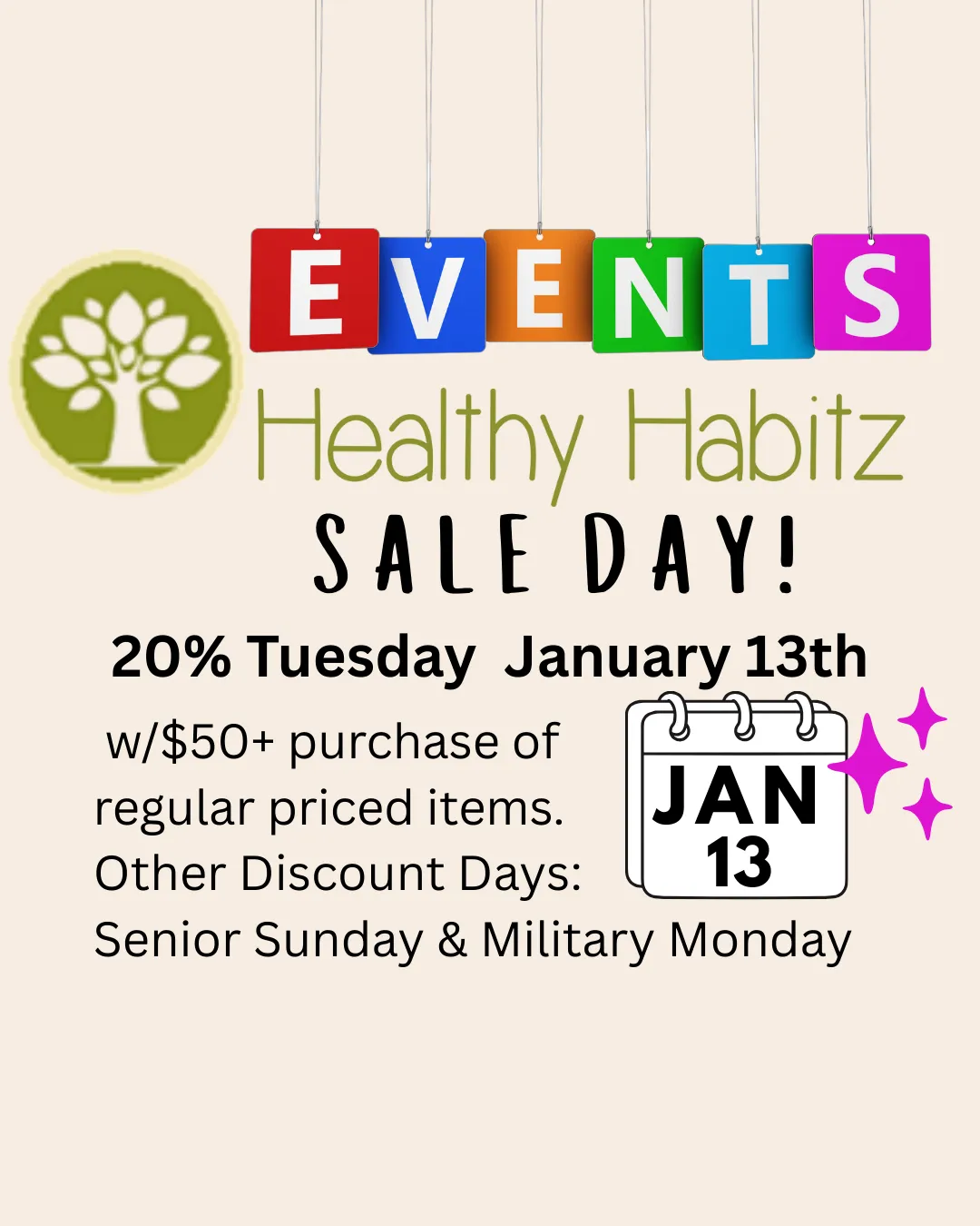 Visit our friends at Healthy Habitz and recieve 20% off your purchased of $50 or more. Sale and clearance items are excluded. Its a great time to stock up and save. Bring a friend and share the joy and savings.